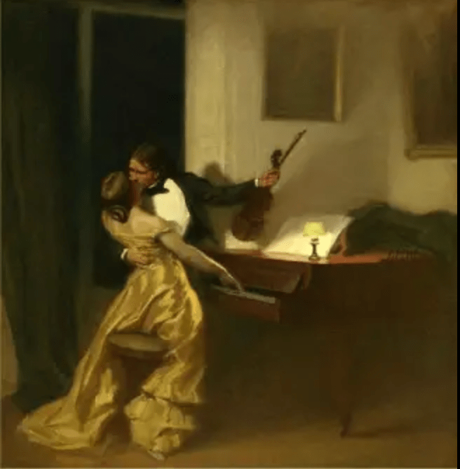 “Estaba torturado, especialmente porque estaba seguro de que hacia mí no tenía otra sensación que de irritación perpetua […] y que este hombre, gracias a su elegancia externa y su novedad, y, sobre todo, gracias a su incuestionable talento y la atracción ejercida bajo la influencia de la música, no solo le agradaría, sino que inevitablemente, y sin dificultad, la subyugaría y conquistaría, y haría con ella lo que quisiera.” — La Sonata Kreutzer, Tolstói (1889).